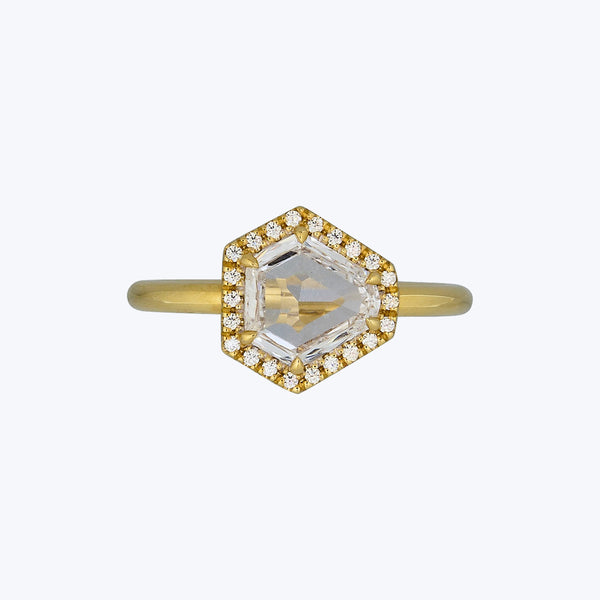 Discover the Jewels by Grace 18KYG 1.04 ct. Kite-Shape Step Cut Diamond Halo Solitaire, an exquisite addition to any fine jewelry collection. This elegant ring is designed with a slender band to highlight the beauty of its step-cut diamond. Crafted in 18K yellow gold. Part of the Jewels by Grace Collection, featuring extraordinary pieces sourced from around the globe.