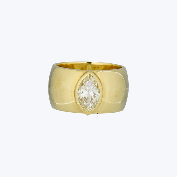 Make a statement with the Jewels by Grace 18KYG 1.48 ct. Marquise Cut Diamond Cigar Band Ring. Featuring a robust gold band set with a marquise-cut diamond, this stunning ring marries masculine form with feminine detail for a contemporary feel. Crafted in 18K yellow gold and set with a 1.48 ct. diamond. Part of the Jewels by Grace Collection, featuring extraordinary pieces sourced from around the globe.