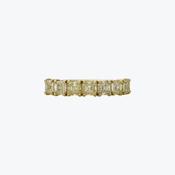 Asscher cut bands are always one of the most elegant styles out there, and this one, set with bright fancy yellow asscher cut diamonds, is even more so. The diamonds have crisp faceting, drawing your eyes into their centers. Their rich yellow colors are enhanced by 18kt yellow gold setting with U-prongs, only adding to the bright pop of color on the finger. Low set, and super elegant. Jewels by Grace Contemporary 18K Yellow Gold 1.77 ct. Asscher Cut Diamond...