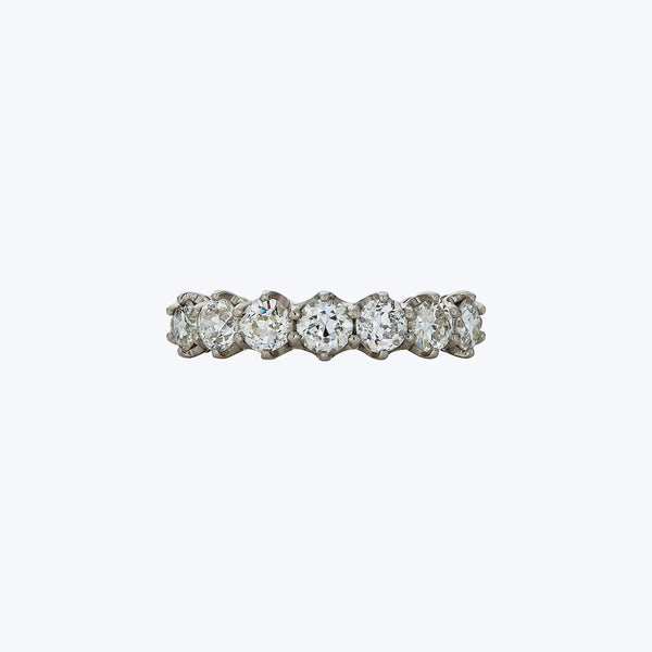 Modeled after antique diamond bands from the Georgian and Victorian eras, this 7-stone band is set with chunky and charming Old European cut diamonds in simple settings with swoopy, airy gallery details.