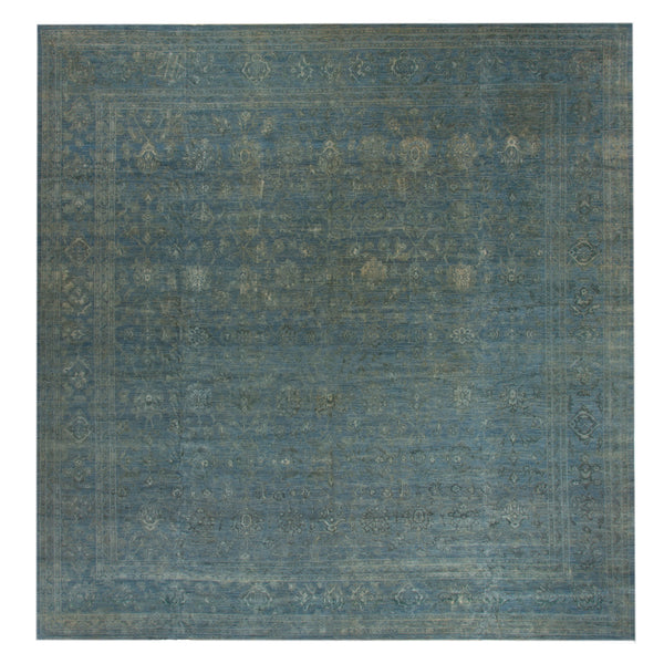 Woven from silk, this rug features a timeworn shade of blue and a subtly luminous design.
