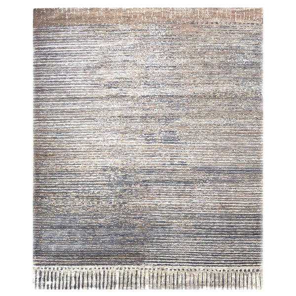 Add a touch of elegance to your space with the Multicolored Transitional Silk Wool Blend Rug - 8' x 10'. Hand Knotted in India, this high-quality rug features horizontal stripes in varying shades of brown, beige, and white. The intricate pattern and detailed texture make it a stunning addition to any room.