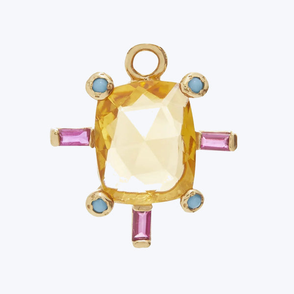Meet the Juno Charm with Citrine! Cast from solid 14k yellow gold, this jewelry charm includes a faceted citrine center surrounded by turquoise ruby baguettes and bright turquoise accents. All Schosha Charms are designed to fit any classic huggies hoops or easily added to your favorite charm bracelet or necklace chain with a charm enhancer, each sold separately. Scosha Jewelry is a colorful, creative combustion of art meets artifact with a signature style that blends the raw with the refined....