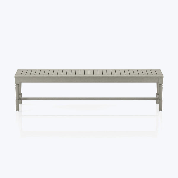 This outdoor dining bench offers high-end, weather-resistant style for those who are crafting outdoor spaces with a thoughtful design eye. Elegant silhouettes matched with high-quality, robust performance materials that won't fade or tear. The frame is made of FSC-certified teak and is expressed in a cool neutral grey.