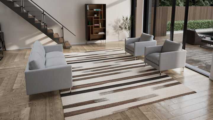 Artistry meets utility in this expansive 10' x 14' flatweave wool rug, transforming the ordinary into a canvas of rich texture and subtle elegance. Crafted by skilled hands in Pakistan, it's not merely a rug—it's a tapestry of design that dances across a warm cream base with an inventive play of horizontal stripes. Deep espresso and medium cocoa blend into lighter greige and taupe, producing a pattern that resists uniformity. It breathes with an organic, abstract fluidity that captures a balance between modern sensibility and natural allure.