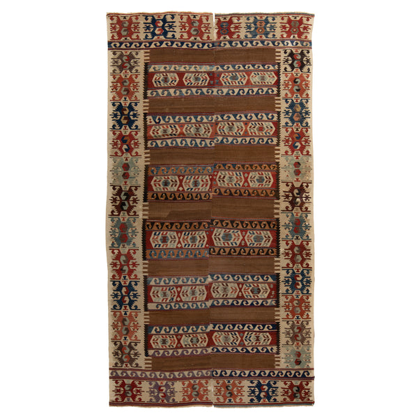 This Turkish Kilim rug, a masterpiece stretching 5'11" by 11'1", commands attention. Its flatwoven form speaks of resilience and strength, weaving together history and artistry in every fiber. Earthy browns form the backdrop of this tapestry, grounding the eye, while vibrant reds, blues, and creams dance across it with vibrant energy. Muted greens and grays add subtle whispers to the chorus of colors, completing a harmonious symphony that emanates warmth and welcome. The design is a study in contrasts, with...