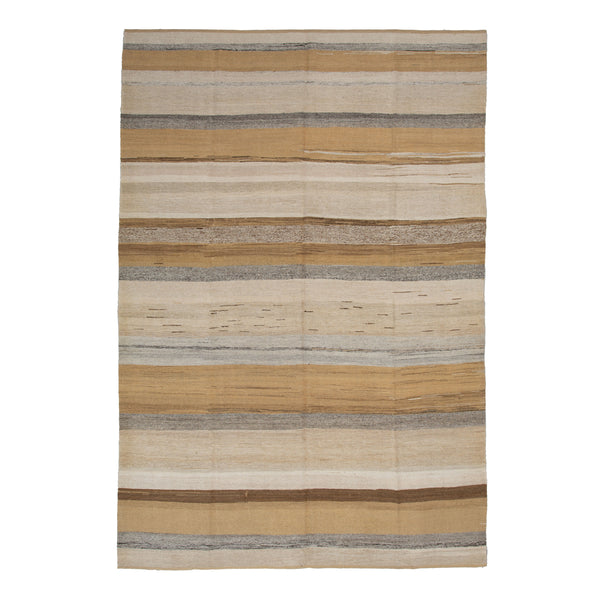 The Multicolored Stripe Flatweave Kilim Hemp Rug does more than just cover the floor; it sets the tone for any room. A magnificent expanse of 9'11" by 14'4", this Turkish Kilim invites you to explore its nuances. Its hand-woven texture, crafted from durable hemp fibers, resists the chaos of daily life with grace. The striped pattern dances across its surface, mingling natural beige, warm gold, subtle grey, and an array of browns, each hue thoughtfully chosen and woven with care....