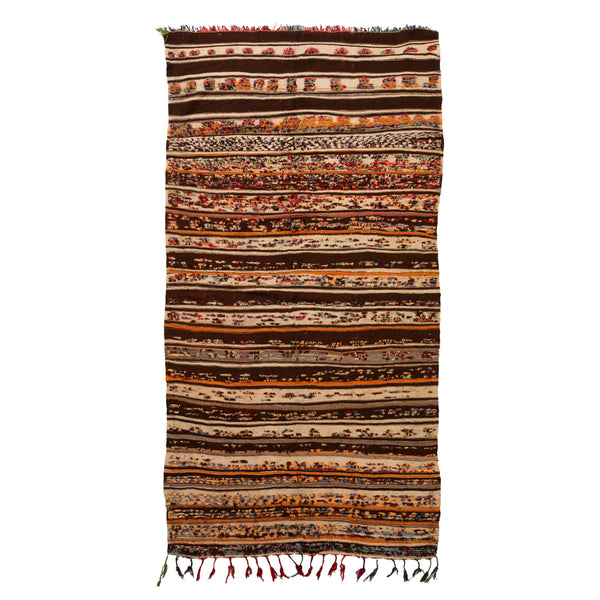 Consider this hand-woven Kilim rug, an exquisite creation that measures 4'10" by 10'4", perfect for extending warmth and charm to a hallway or sprawling across a sizeable living room. Crafted from pure natural wool, it marries durability with a soft, inviting texture. The rug’s strikingly earthy palette draws you in: shades of brown and creamy beige form the base, setting the stage for flashes of orange, rust, and understated reds, all peppered with hints of gray. Intricate stripes reveal small-scale...
