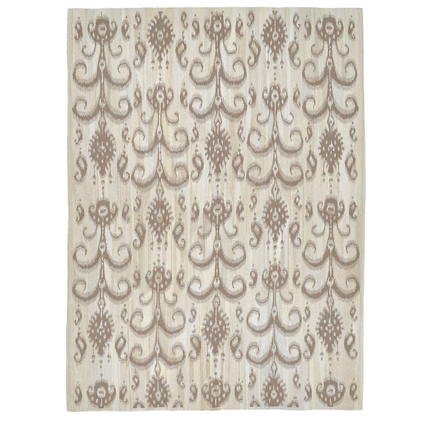 The Beige Ikat Flatweave Wool Rug draws the eye without demanding attention. At 9' by 12', it doesn't just sit; it sprawls, anchoring the room with a quiet confidence. Its Ikat pattern is an exercise in controlled elegance—stylized motifs rendered in warm browns and taupes cascade over a creamy beige expanse. It's a design that whispers rather than shouts, its feathered edges a testament to artisanal craftsmanship, achieving complexity without confusion. This rug is the product of skilled hands, woven...