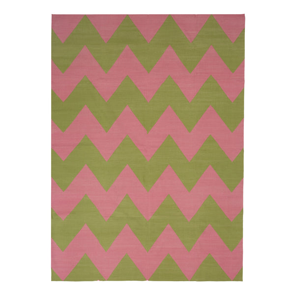 The 10' x 14' Pink & Green Chevron Cotton Rug doesn’t just sit in a room; it declares its presence with an audacious zigzag dance of color. Kaleidoscopic pinks meet energetic greens, offering a swift jolt to the senses, anchoring any space with intention and character. This rug is more than an accessory; it's a vibrant proclamation of style. Woven meticulously by the deft hands of artisans, this flatweave kilim melds centuries-old tradition with a breath of modernity, particularly suited...