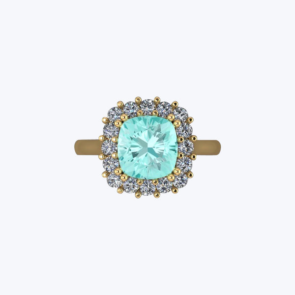 The Lagoon Tourmaline Flower Ring features a cushion cut center stone with a halo of diamonds and gold band.