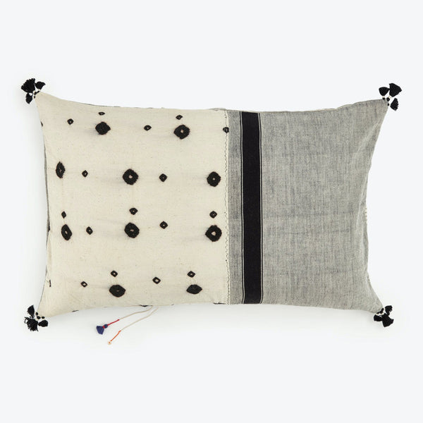 The Large Dot Jat Pillow, measuring 16" x 24", is a captivating piece that combines bold design with artisanal craftsmanship. Made from 100% organic cotton, this pillow showcases a distinctive design, featuring two contrasting fabric patterns. One side presents a soft off-white backdrop adorned with black dots and smaller accentuating details, while the other side is a sophisticated solid gray, marked by a vertical black stripe and delicate white stitching.Handcrafted in India, the Large Dot Jat Pillow offers a unique...