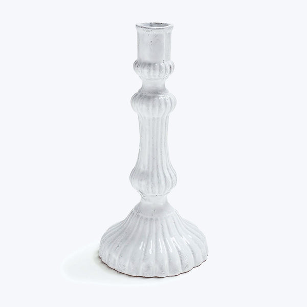 The Peggy candlestick interprets the lines of a scallop seashell for a formal yet beachy aesthetic. Hand molded from black terracotta, each piece is finished in a milky-white glaze that highlights the unique character of the clay, celebrating its imperfections and ensuring that no two pieces are exactly alike. Romantically bohemian, yet practical for everyday use, these pieces are made in an antique Bastille workshop, historically home to Napoleon Bonaparte's own silversmith.
