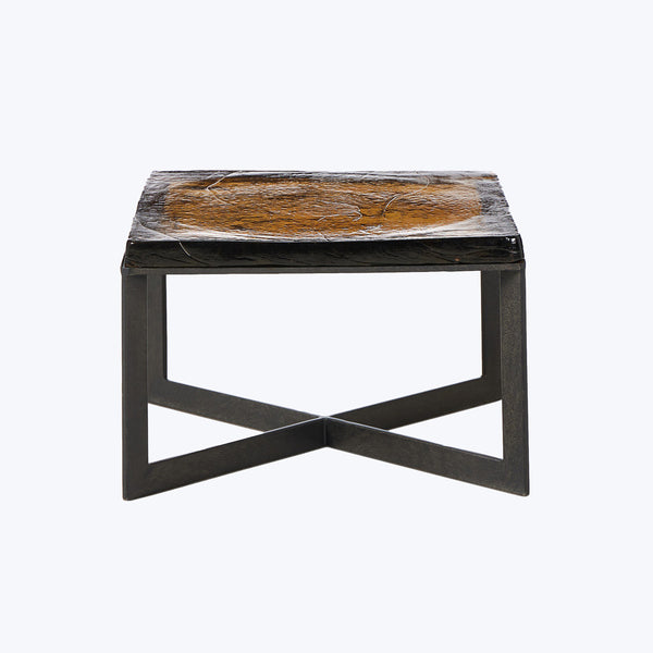 Sculptural yet subtle, the Lennie Bunching Table brings together molten form and grounded structure. A squared top of amber cast glass floats above an airy, angular base in burnished charcoal iron—light-catching and unexpectedly warm.
