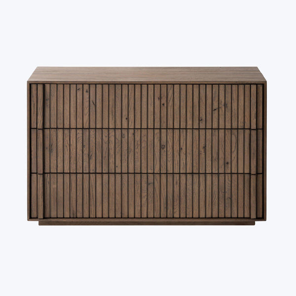The Four Hands Leo Nightstand marries modern minimalism with Brazilian-inspired elegance, a refined creation by designers Thomas Bina and Ronald Sasson. Crafted from solid oak and thick oak veneer, this clean-lined piece measures 35" W x 18.25" D x 22" H and weighs 88.18 lb, exuding both durability and sophistication. Vertical reed detailing along the drawer fronts adds texture and depth, while sleek wooden pulls along the edges highlight its thoughtful design.With a rustic brown finish that complements a range...