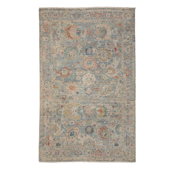 This traditional area rug measures 5'10" x 8'10" and features a primary Light Blue color palette. It is crafted from wool, providing a soft texture and natural resilience. The rug's design embodies an Antique Revival style, presenting the visual character of a vintage heirloom. The intricate pattern showcases classic motifs, including ornate medallions and floral elements, presented with a deliberately faded or distressed finish. This technique creates an aged appearance while maintaining the rug's structural integrity. Complementary colors such as...