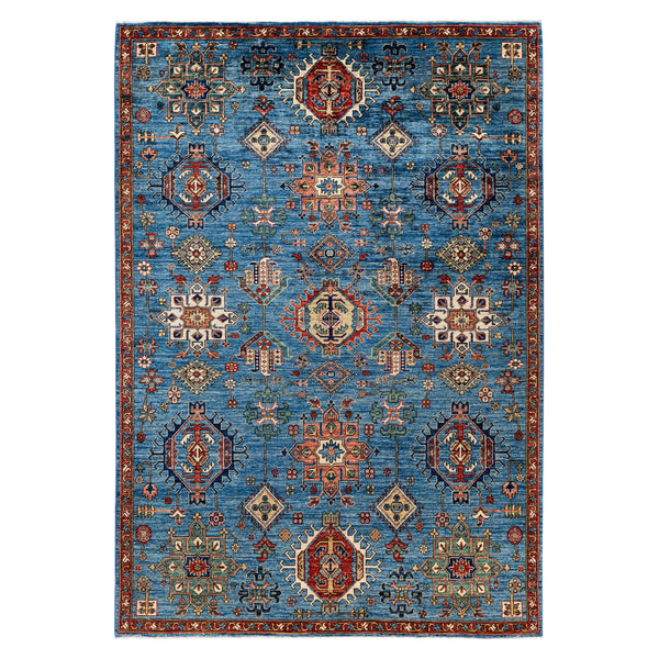 This hand-knotted Serapi-style wool rug measures 6 feet by 8 feet 11 inches, offering a traditional aesthetic for various interiors. Crafted from durable wool in Pakistan, it features a predominant light blue field. The rug's surface displays an all-over pattern of distinct, angular geometric medallions and tribal motifs. These designs incorporate a range of accent colors, including shades of red, dark blue, cream, gold, and green, which provide visual depth against the light blue background. A multi-layered border frames the...