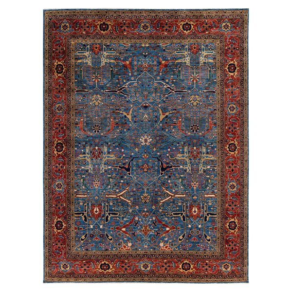 This Blue Traditional Serapi Wool Rug measures 9 feet by 11 feet 11 inches, offering a classic design suitable for a range of interior settings. Hand-knotted from durable wool in Pakistan, this large area rug provides both a refined aesthetic and lasting quality. The rug's central field showcases a detailed, all-over pattern in varying shades of blue, from lighter tones to deeper indigo. This intricate design incorporates stylized floral and geometric motifs, presented in colors such as cream, rust, and...