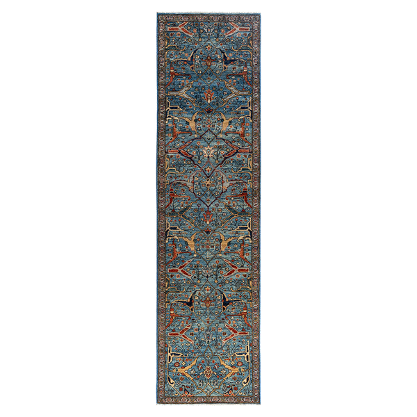 The Light Blue Traditional Serapi Wool Runner is a beautifully crafted traditional rug from Pakistan. Hand knotted out of wool, it features a symmetrical pattern with geometric shapes and floral motifs in rich blue, gold, red, and beige colors. The intricate design and high-quality materials make this rug a stunning addition to any home.