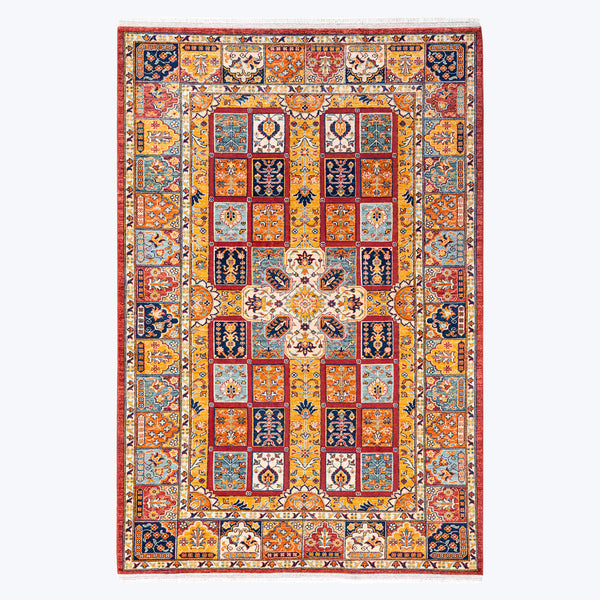 This Yellow Traditional Wool Rug - 6' 4" x 9' 5" showcases vibrant shades of blue, orange, red, and cream. Hand-knotted in India, it features a symmetrical design with rich detailing, plus intricate floral and geometric patterns. Made from high-quality wool, it's a beautiful addition to any space.