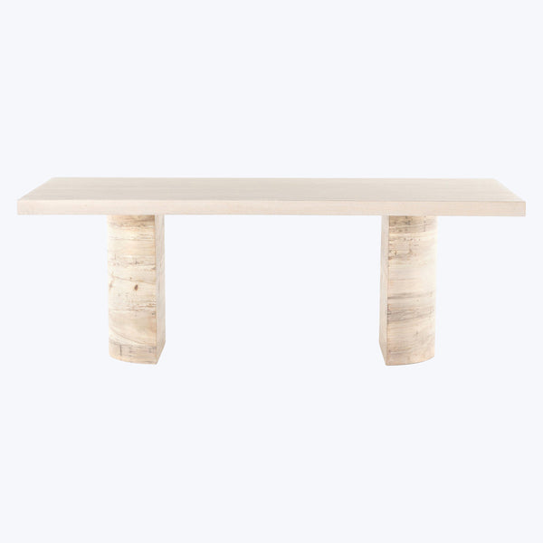 Organic in tone, sculptural in spirit. Inspired by bold Eighties-era design, a rectangular dining table of thick oak veneer features beautifully shaped legs in a bleached finish, with a pale tabletop for subtle contrast of tone. Seats six comfortably.