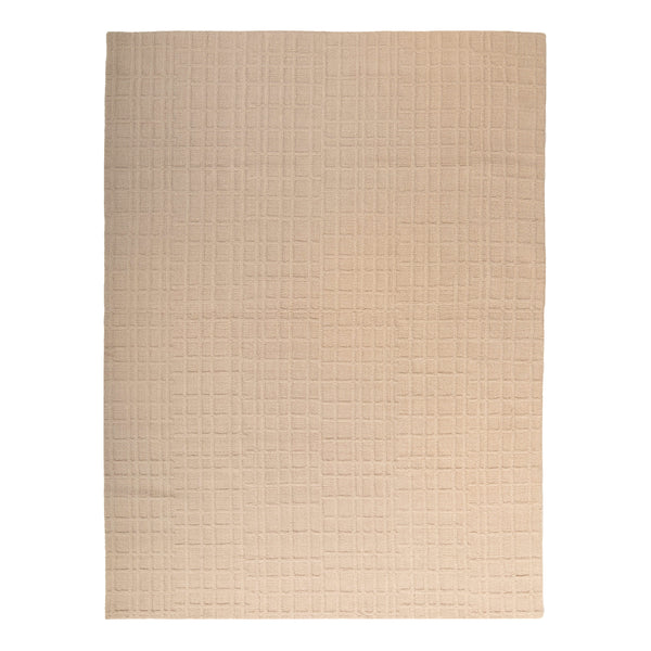 The Beige Solid Alpaca Solids Rug - 8' x 10' features a neutral beige color and textured pattern of raised squares. Hand-woven in India from luxurious alpaca fibers, this high-quality rug adds comfort and style to any space.