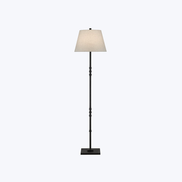 The Lohn Floor Lamp has subtle ornamentations on its thin stem: up-turned fluted motifs point toward the beige poplin shade while down-turned accents point toward the simple stacked base. These elements on this black floor lamp are fashioned from cast-iron in a Mole black finish.