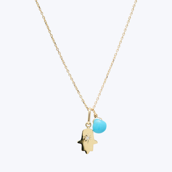 An hamsa charm hangs delicately off of a gold chain complimented by a turquoise briolette.
