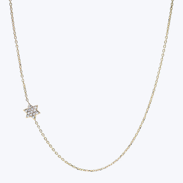 A delicate pavé set star of david is soldered onto a dainty gold chain. This feminine necklace is great for layering. Chain measures 16"