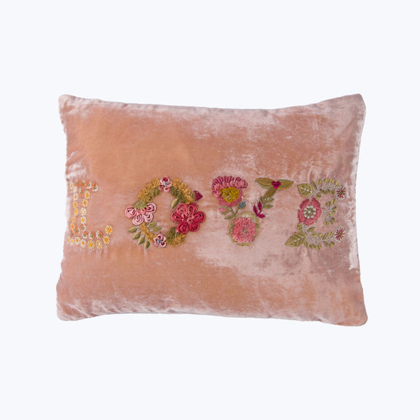 Bring bohemian romance to your space with Anke Drechsel’s Love Silk Velvet Lumbar Pillow. Crafted in plush silk velvet, this beautiful lumbar pillow features hand-embroidered florals meticulously stitched by master artisans in India. Available in Pink Quartz and Watermelon.
