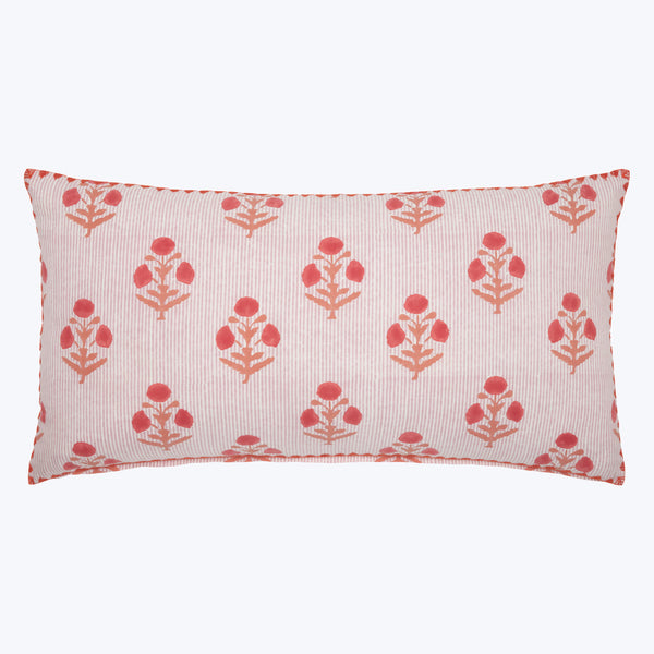 Coral blossoms, placed over subtle stripes. Hand block printed on cotton linen. Hand stitched red edging. Print on both sides of the pillow.