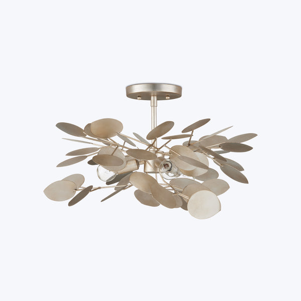 Bring bohemian beauty to your interiors with the Lunaria Semi-Flush Mount by Currey & Company. Crafted in wrought iron in a silver leaf finish, this elegant fixture features fluttering discs reminiscent of its botanical namesake. The light from the bulbs illuminate the metal petals, creating an enchanting glow. A stunning piece for eclectic and daring contemporary spaces.