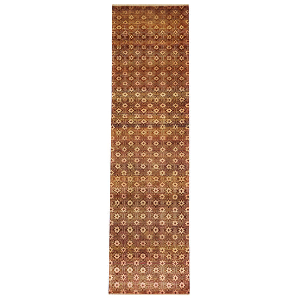 This hand-knotted runner from the Alchemy Rug Collection offers a blend of contemporary style and traditional craftsmanship. Measuring 3'2" by 12'4", this long rug is designed to enhance various spaces within the home. Crafted in India, this runner features a durable wool and silk blend. The combination of materials provides both resilience and a soft underfoot feel. The primary color, designated as orange, is expressed through a spectrum of warm, earthy hues including deep rust, terracotta, and golden undertones. These...