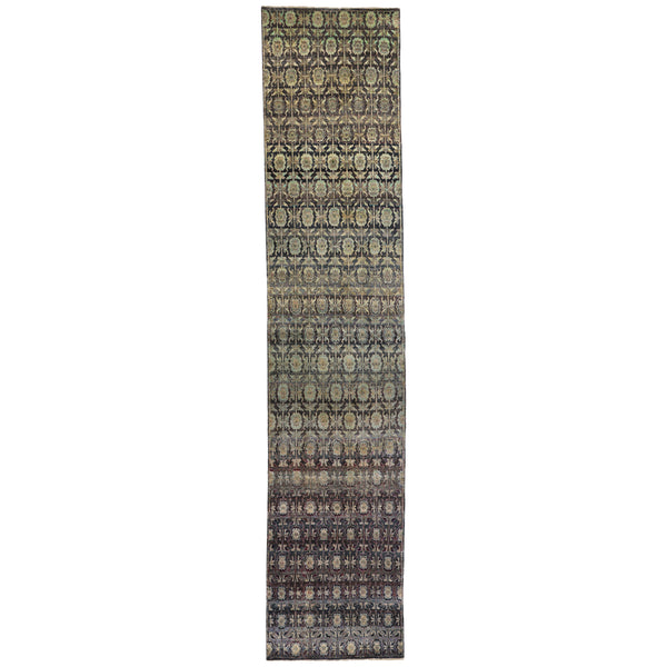 The Multicolored Alchemy Contemporary Wool Silk Blend Runner is a beautifully crafted 3' x 14'6" piece from India. Featuring a symmetrical floral or geometric design in muted tones of grays, beiges, and faded blues, this hand-knotted runner exudes traditional elegance. The intricate pattern and high-quality Wool Silk Blend material make it a perfect choice for adding sophistication to any hallway or narrow space.