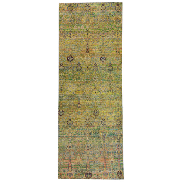 This Green Alchemy Contemporary Wool Silk Blend Runner is a beautifully crafted 3' x 8'8" carpet from India. The intricate design features green, yellow, and brown earth tones in a faded, vintage-looking pattern. Hand knotted with a fine weave, this high quality rug is a stunning addition to any home.