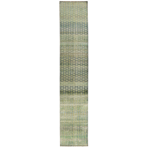 This runner from the Alchemy Rug Collection provides a blend of contemporary design and traditional craftsmanship. Measuring 3 feet 1 inch by 16 feet 10 inches, it is suitable for hallways, entryways, or long transitional spaces within the home. The rug is hand-knotted in India, showcasing expert artisan construction. It is crafted from a wool and silk blend, combining the natural durability and soft texture of wool with the subtle sheen and luxurious feel of silk fibers. This material composition...