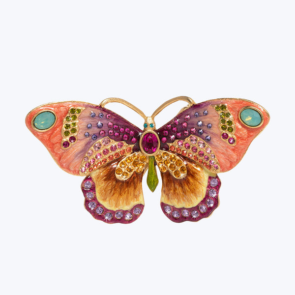 A jeweled fluttering butterfly to alight a tabletop anywhere in your home! Lifted on delicate metal legs, the Madame butterfly’s wings are beautifully hand-painted in ombre gold, lavender and rose enamels with hand-set Swarovski® crystals in shades of fuchsia, olivine and topaz. Carved in metal, finished in 14K gold and detailed with a jeweler’s attention to crystal stone setting including large faceted oval fuchsia and opal crystals.Figurine in metal with a 14K gold finish, hand-enameled and hand-set with Swarovski® crystals.