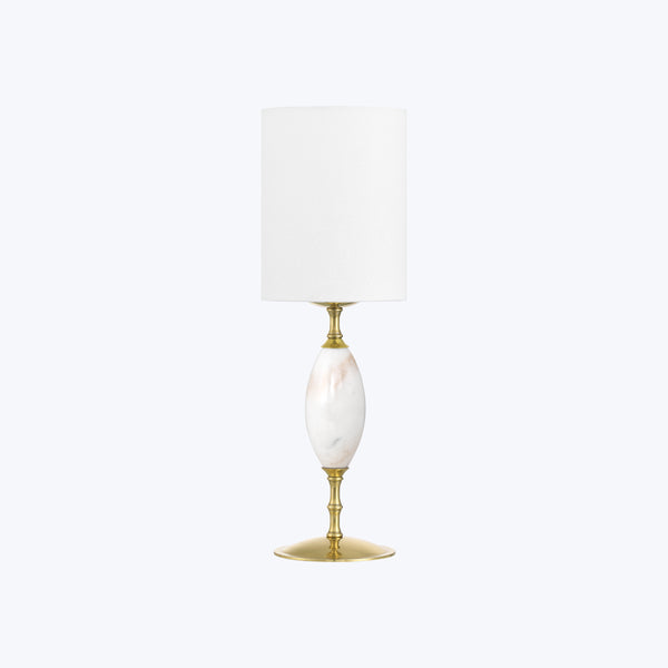 The Marche White Cordless Table Lamp has a slender metal body in a brass finish that frames an oval of white marble at its center. The position of the veined stone makes the little lamp jewelry-like. A tall, cylindrical white hardback shade enhances the lamp’s streamlined silhouette, while a rechargeable bulb offers cordless convenience. The fixture is dimmable.