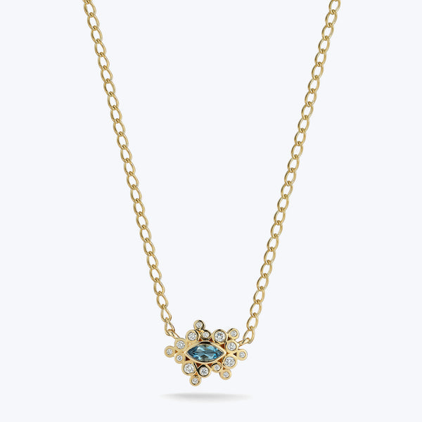 A vibrant aquamarine sourced from the Zimbaqua Aquamarine mine is surrounded by effervescent diamond bubbles with an 18k yellow gold setting in this signature Marquise Bubble Necklace. Renna Jewelry showcases the highest quality pieces for the modern woman — nostalgically chic and eclectically elegant. Adjustable 16-17". Diamonds .16 tcw. aquamarine .20 tcw.