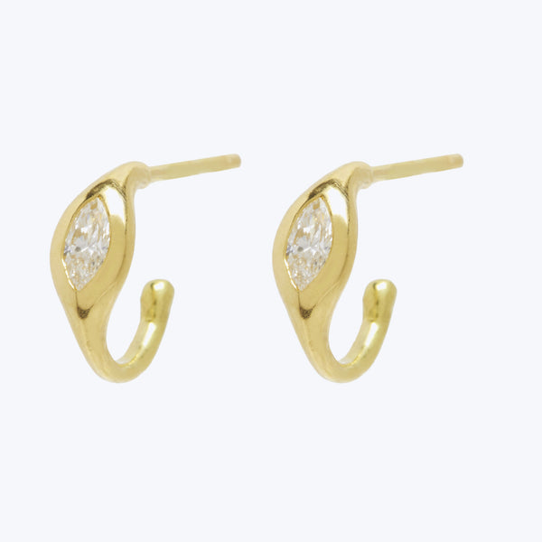 This pair of Marquise Huggies Earrings is an exquisite shape that perfectly hugs your ear in the first or second hole. This pair of diamond huggie earrings features a central sparkling marquise diamond flawlessly placed in a polished 18k gold carved setting. An easy way to dress up the everyday. 0.18ct total diamond weight. Dianna Mitchell Fine Jewelry is made in Brooklyn and characterized by clean, modern forms that feel sculptural, yet distinctly feminine. Each diamond is hand-picked and set...