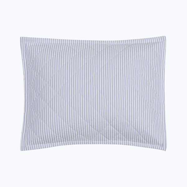 Matteo provides sophisticated top-of-bed options that evoke elegant menswear fabrics. Our interpretation is sharp seersucker with a two-toned stripe and finished with a 1-inch flange. You'll love its dapper look as a duvet, shams, and a quilt with a 4-inch diamond stitch pattern.