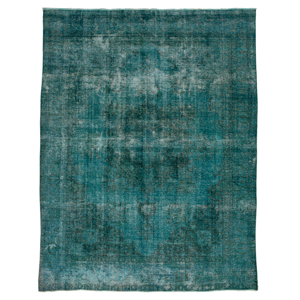 Neutralized of its original color, this Blue Green Modern Wool Rug - 9'10" x 12'5" showcases a faint abstract traditional motif below its neutralizing distressed finish. This transitional rug is a unique look that complements modern, traditional, and contemporary spaces with its abstract solid design and rich green-blue color that becomes more intricate upon further inspection. Handcrafted from high-quality wool, this overdyed rug is a durable foundation for your living room, bedroom, or home office.