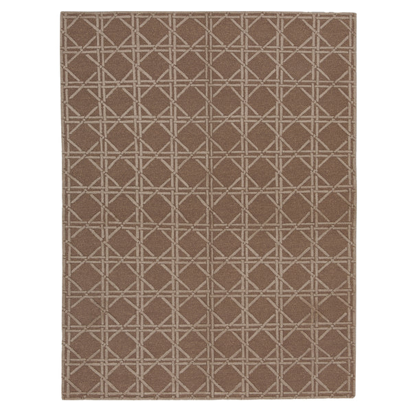 This contemporary area rug provides a blend of modern design and traditional craftsmanship. Measuring 5' 7" x 7' 7", this hand-knotted rug is crafted from 100% natural wool, offering both durability and a soft texture underfoot. The rug features a rich brown primary color, accented by a lighter brown geometric pattern. This intricate design forms a repeating lattice or cane weave, providing visual depth and a subtle textural appearance. The tonal variation between the two shades of brown creates a...