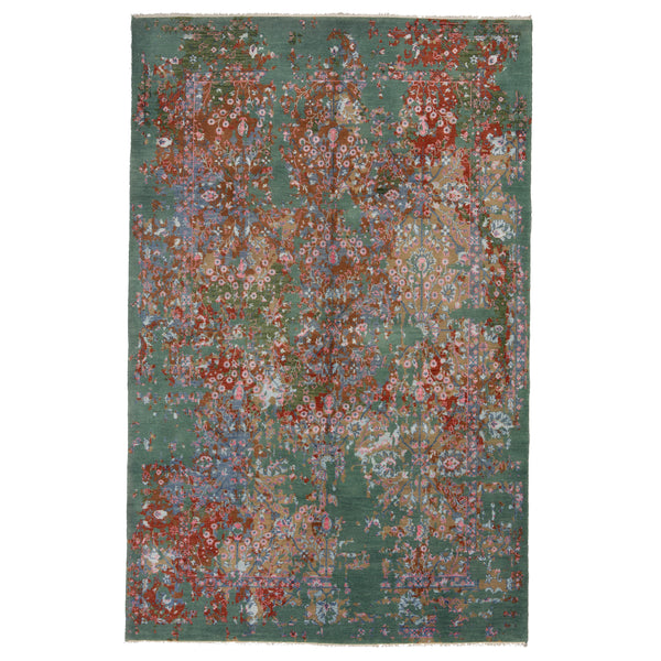 This Multicolored Abstract Overdyed Wool Rug 6'2" x 9'6" is expertly hand-knotted in India from durable wool for a long-lasting piece of one-of-a-kind character for your modern home. This overdyed bohemian rug is the epitome of elegance with a multicolored floral design overlayed on an abstract green, brown, and red backdrop. This 6x9 rug is a captivating centerpiece that will elevate your bedroom, living room, or dining room with its garden charm and luxurious feel.