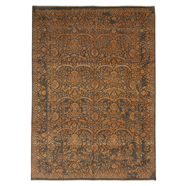 Expertly crafted in India, this Orange Modern Wool Rug - 9' x 12'4" is hand-knotted from durable wool for a long-lasting piece of one-of-a-kind character for your modern home. This modern traditional rug features a timeless royal gold design overlayed on an intricate field of grey. Incredibly captivating, this 9x12 modern rug is a high-quality centerpiece that will elevate your space with its elegant flair and luxurious feel.