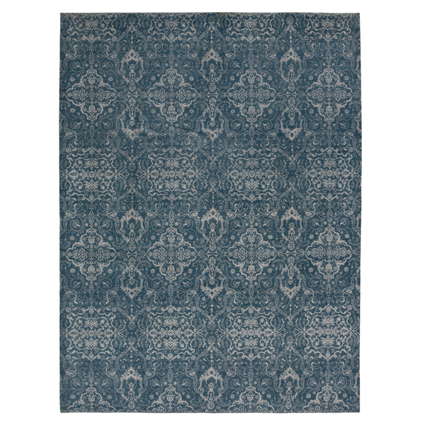 Indulge in the vintage allure of this Blue Modern Wool Rug - 8'3" x 10'4". This one-of-a-kind geometric rug is made from premium durable wool and filled with timeless charm courtesy of its repeating decorative motif in blue and white. Reminiscent of traditional mosaics, this 8x10 modern rug offers a mesmerizing visual impact in your living room, dining room, or bedroom.