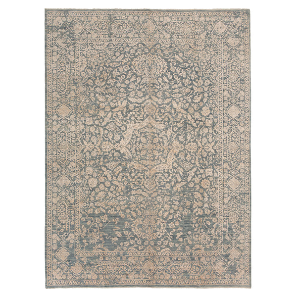 Expertly crafted in India, this Beige Modern Wool Rug - 9'1" x 12'1" is hand-knotted from durable wool for a long-lasting piece of one-of-a-kind character for your modern home. This traditional modern rug features a timeless cream high-low medallion design overlayed on a central striated field of grey and green. Incredibly captivating, this 9x12 rug is a high-quality centerpiece that will elevate your space with its elegant flair and luxurious feel.