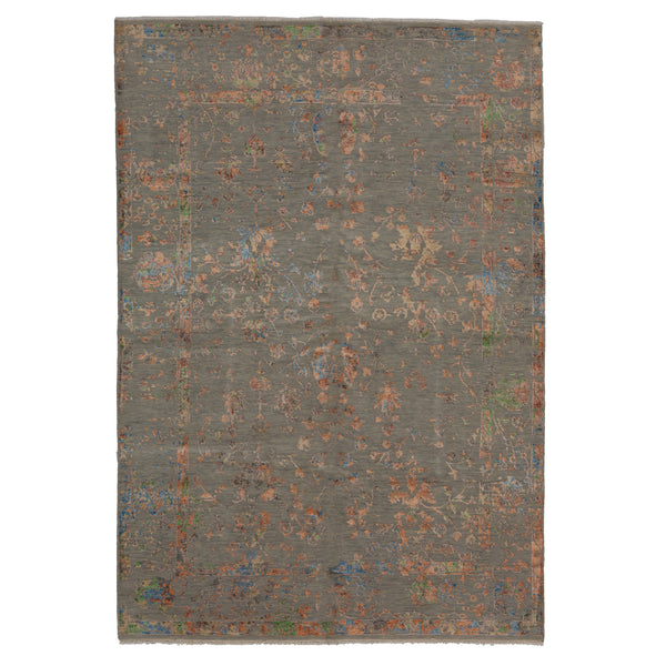This Distressed Traditional Wool Rug 6'3" x 9'1" is expertly hand-knotted in India from durable wool for a long-lasting piece of one-of-a-kind character for your modern home. This modern rug is the epitome of elegance with a distressed traditional design overdyed with a grey-green hue. This 6x9 rug is a captivating centerpiece that will elevate your bedroom, living room, or dining room with its romantic charm and luxurious feel.