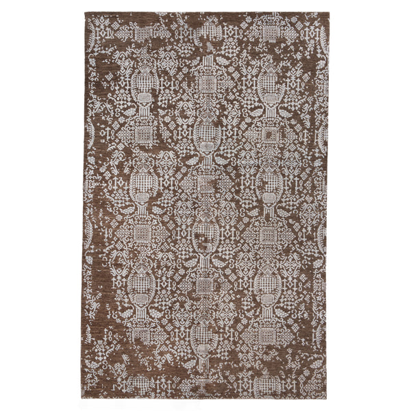 This Traditional Modern Viscose Wool Rug 5'2" x 8'1" is expertly hand-knotted in India from durable wool for a long-lasting piece of one-of-a-kind character for your modern home. This traditional modern rug is the epitome of elegance with a distressed traditional design overlayed on a striated brown backdrop. This 5x8 rug is a captivating centerpiece that will elevate your bedroom, living room, or dining room with its romantic charm and luxurious feel.