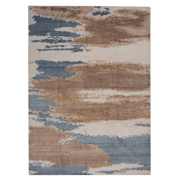Expertly crafted in India, this Multicolored Modern Cotton Blend Rug - 9'1" x 12'3" is hand-knotted from durable wool for a long-lasting piece of one-of-a-kind character for your modern home. This contemporary rug features an abstract design in shifting shades of blue, tan, and off-white. Incredibly captivating, this 9x12 abstract rug is a high-quality centerpiece that will elevate your space with its artistic flair and luxurious feel.